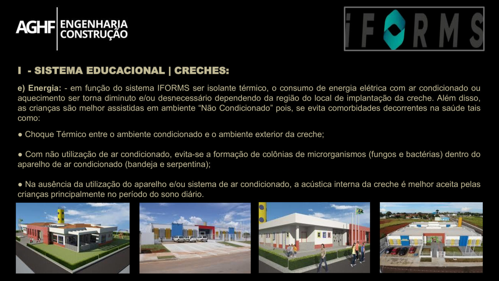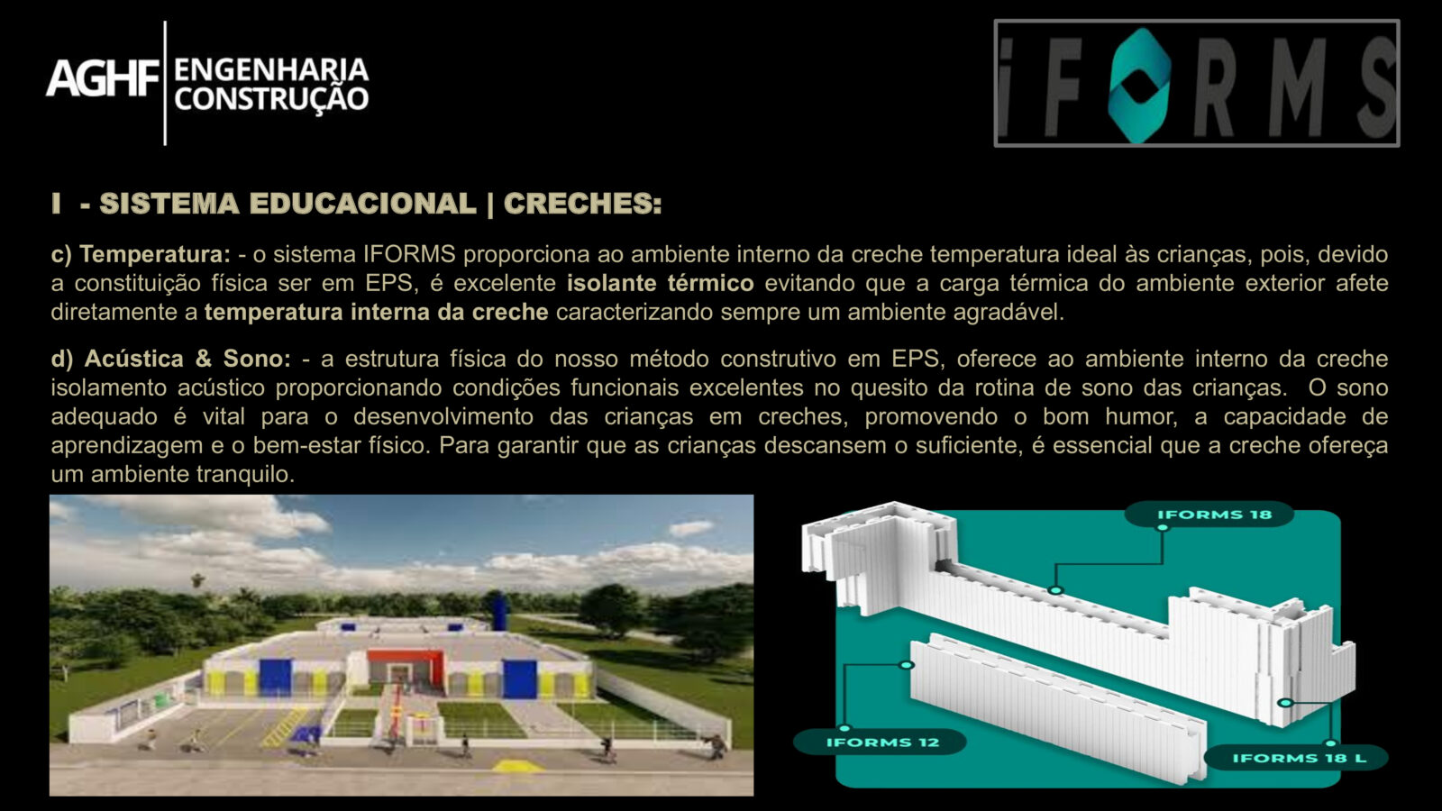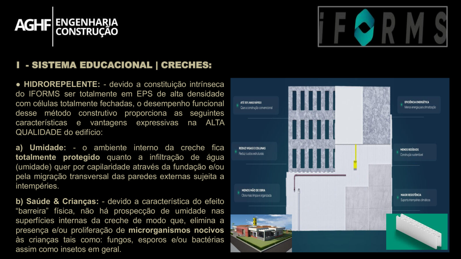 A empresa utiliza o sistema construtivo IFORMS, certificado pelo IPT/SINAT/CEF (DATEC nº 045), que possibilita erguer escolas e creches em metade do tempo da construção convencional em alvenaria, sem perder qualidade ou robustez estrutural. Essa tecnologia é reconhecida por combinar eficiência, sustentabilidade e segurança, aspectos fundamentais para o ambiente escolar.