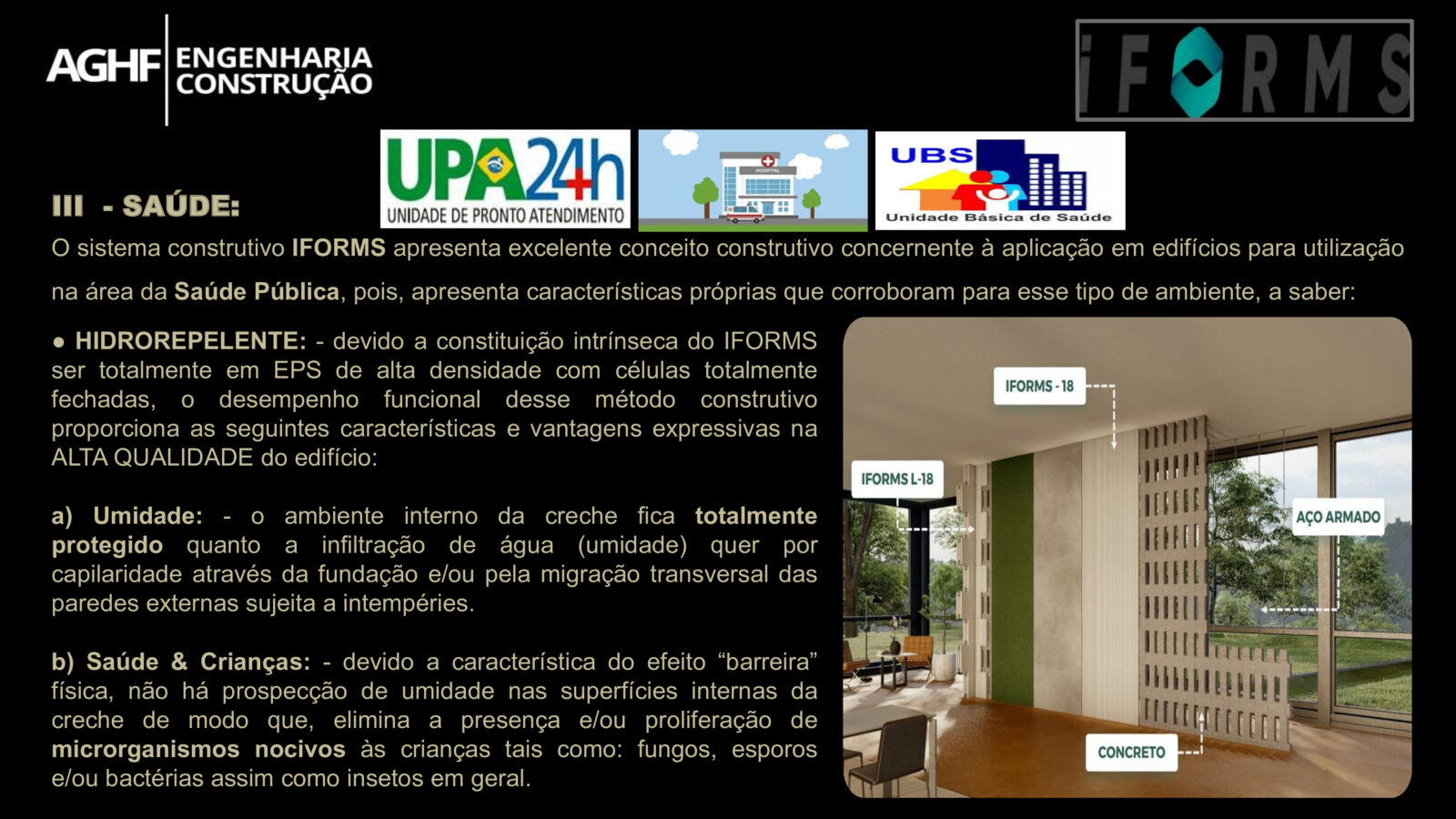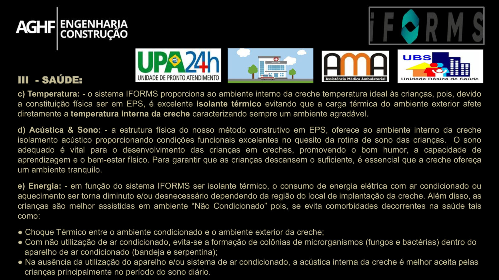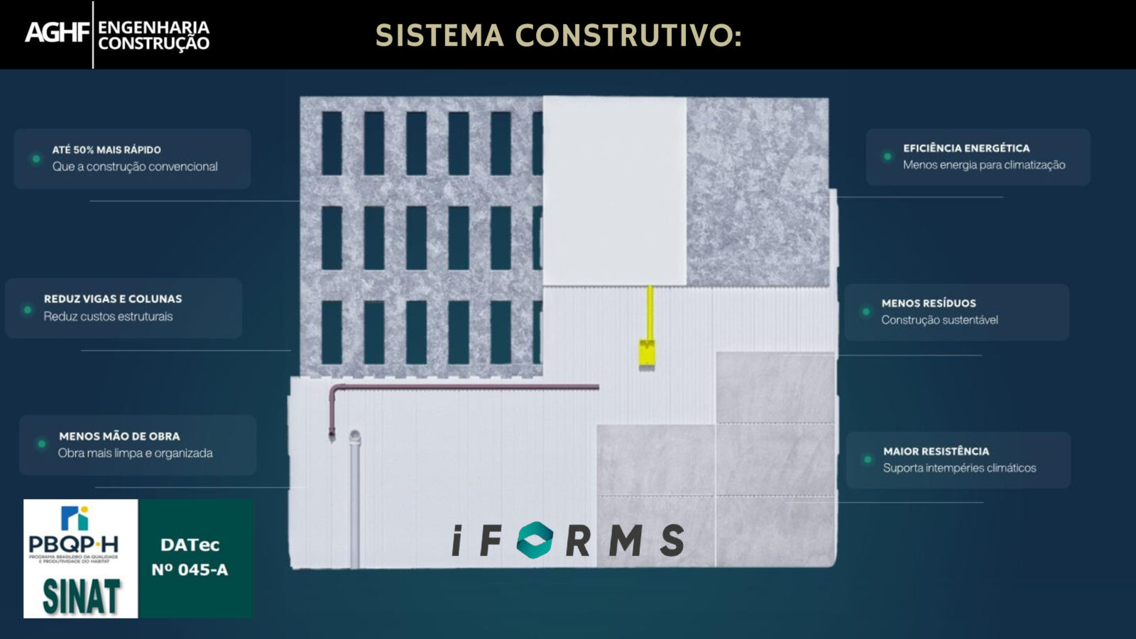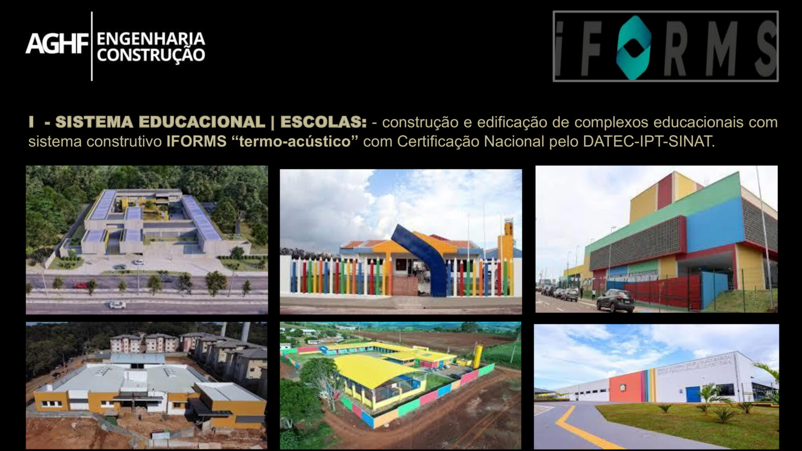A empresa utiliza o sistema construtivo IFORMS, certificado pelo IPT/SINAT/CEF (DATEC nº 045), que possibilita erguer escolas e creches em metade do tempo da construção convencional em alvenaria, sem perder qualidade ou robustez estrutural. Essa tecnologia é reconhecida por combinar eficiência, sustentabilidade e segurança, aspectos fundamentais para o ambiente escolar.