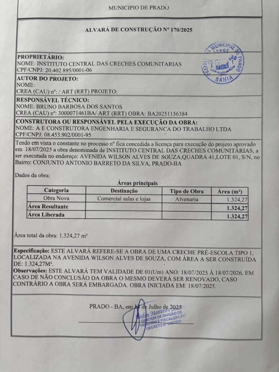 Prefeitura Municipal de Prado, na Bahia, libera alvará para construção da primeira unidade de creches publica nos padrões FNDE, do projeto da Central das creches do Brasil. O projeto tem o objetivo de zerar o déficit de vagas de creche pública em todos os Estados brasileiros, atualmente faltam quase um milhão de vagas em creche. 13.500 novas unidades de creches estão sendo projetadas para os próximos 10 anos. O projeto é uma iniciativa da Central das creches do Brasil, que há quase 2 décadas atua em defesa da educação infantil na primeira infância no país, em parceria com com apoio de soberania internacional e ajuda humanitária a primeira unidade de creches públicas do projeto, tera as obras iniciadas até o final do mês de julho, os preparativos, com terra planejam e nivelamento do terrenos já foram feitos. inclusive o alvará de construção já foi liberado pela prefeitura. Para o presidente da Central das creches do Brasil, essa é a primeira das 13.500 unidades de obras de creches que já está para iniciar nos próximos dias.