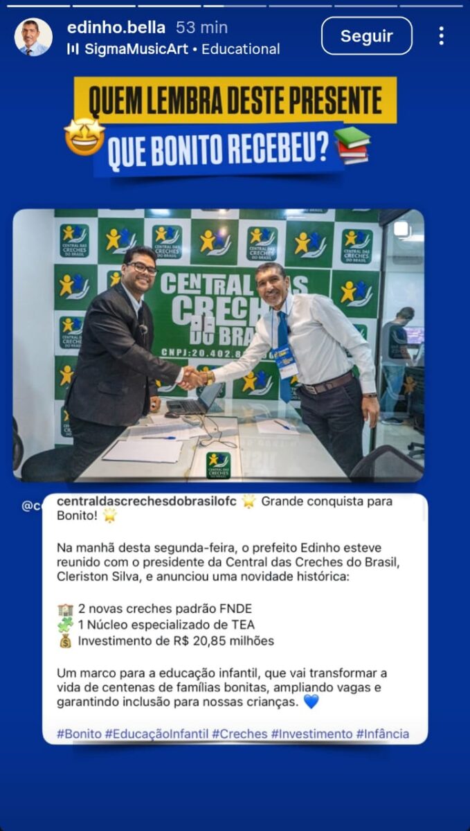 O ato simbólico, realizado em cerimônia solene no município, contou com a presença da Diretora da Região Nordeste da Central das Creches do Brasil, Sra. Elesangelas Francis, e do Coordenador Nacional Alfredo Cerni, além do Prefeito de Bonito, Sr. Edinho Bella, que celebrou o início de uma obra histórica para a educação infantil local.
