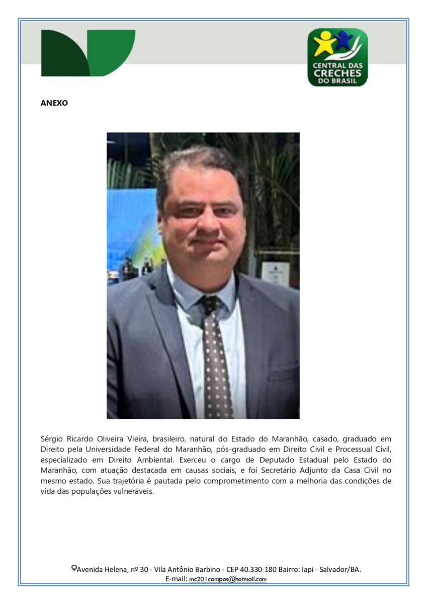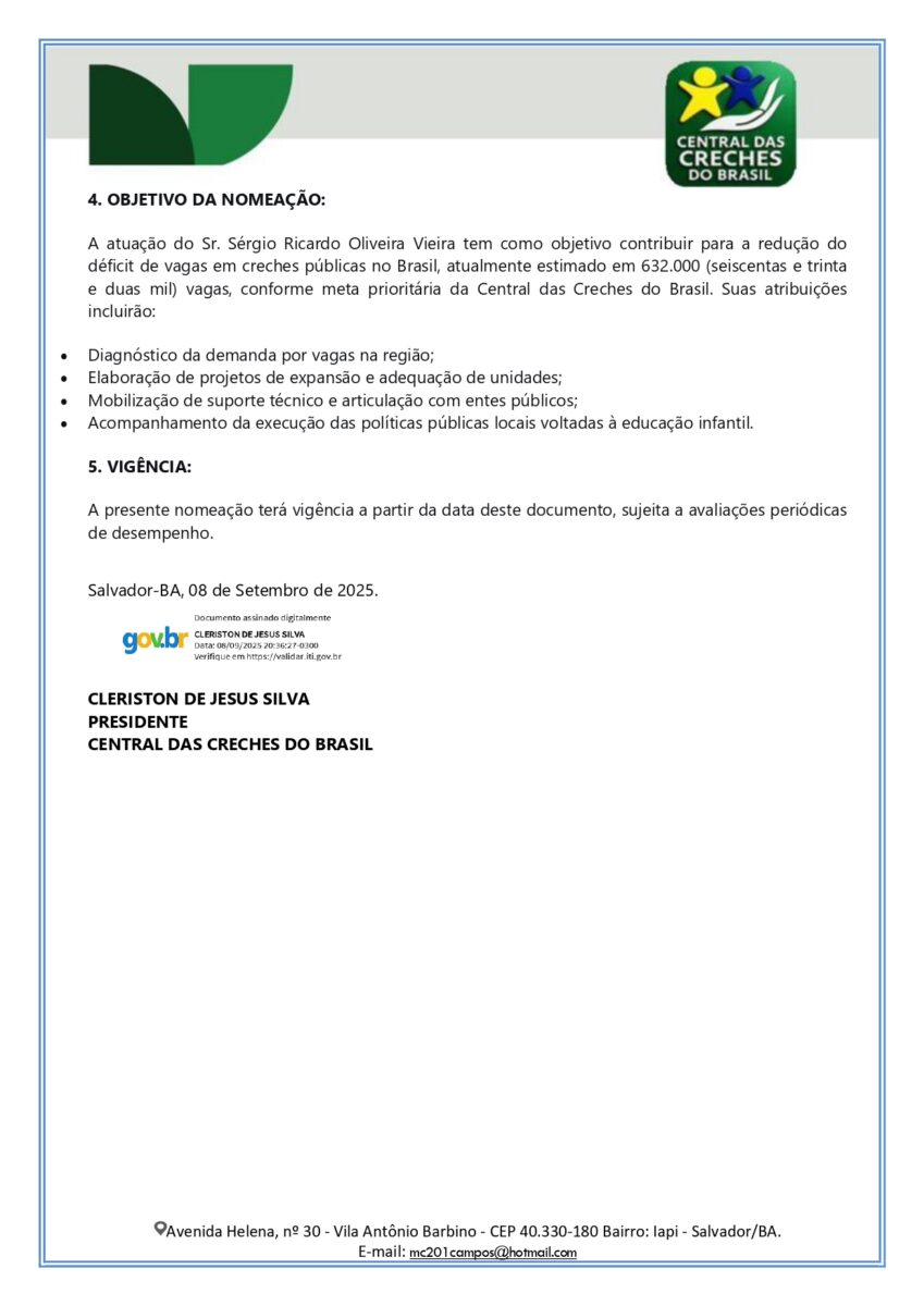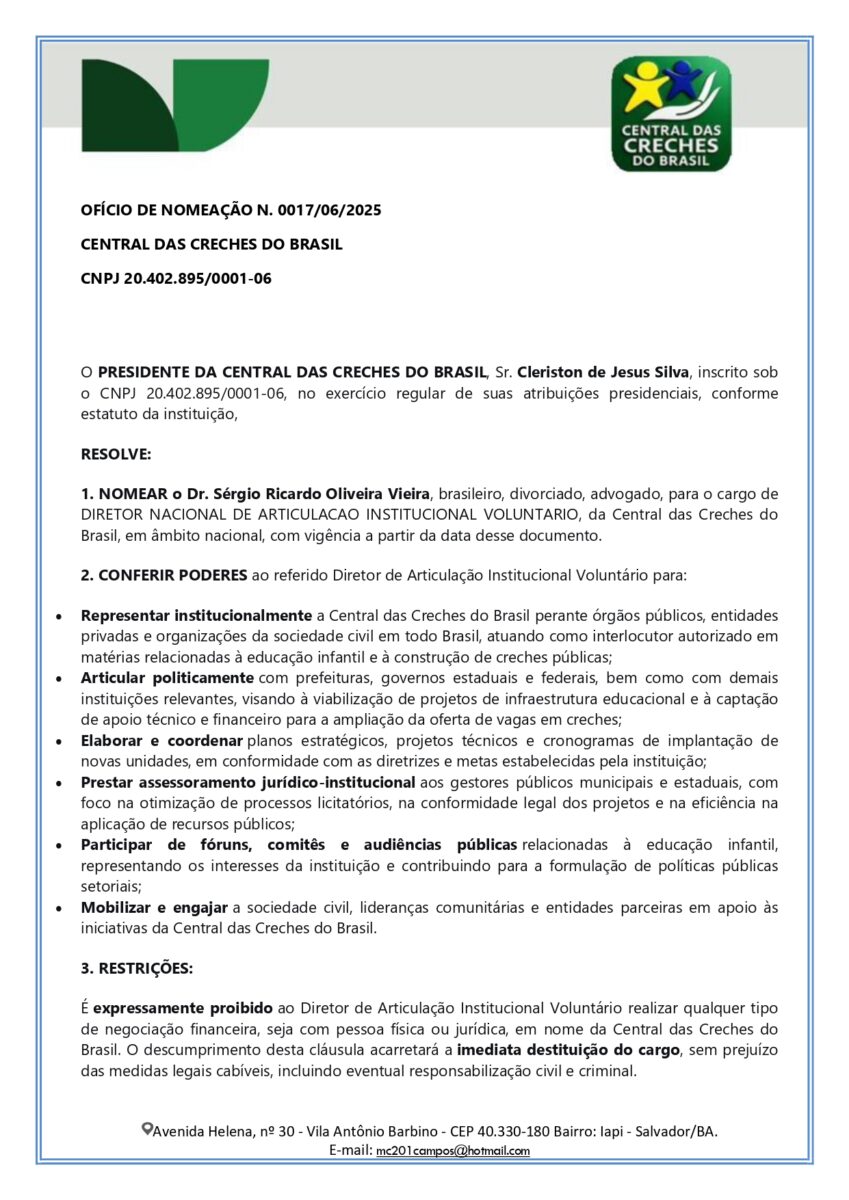 A Central das Creches do Brasil anunciou oficialmente a nomeação do Dr. Sérgio Ricardo Oliveira Vieira para o cargo de Diretor Nacional de Articulação Institucional Voluntário. A decisão foi formalizada pelo presidente da entidade, Cleriston de Jesus Silva, em ofício publicado no dia 08 de setembro de 2025.