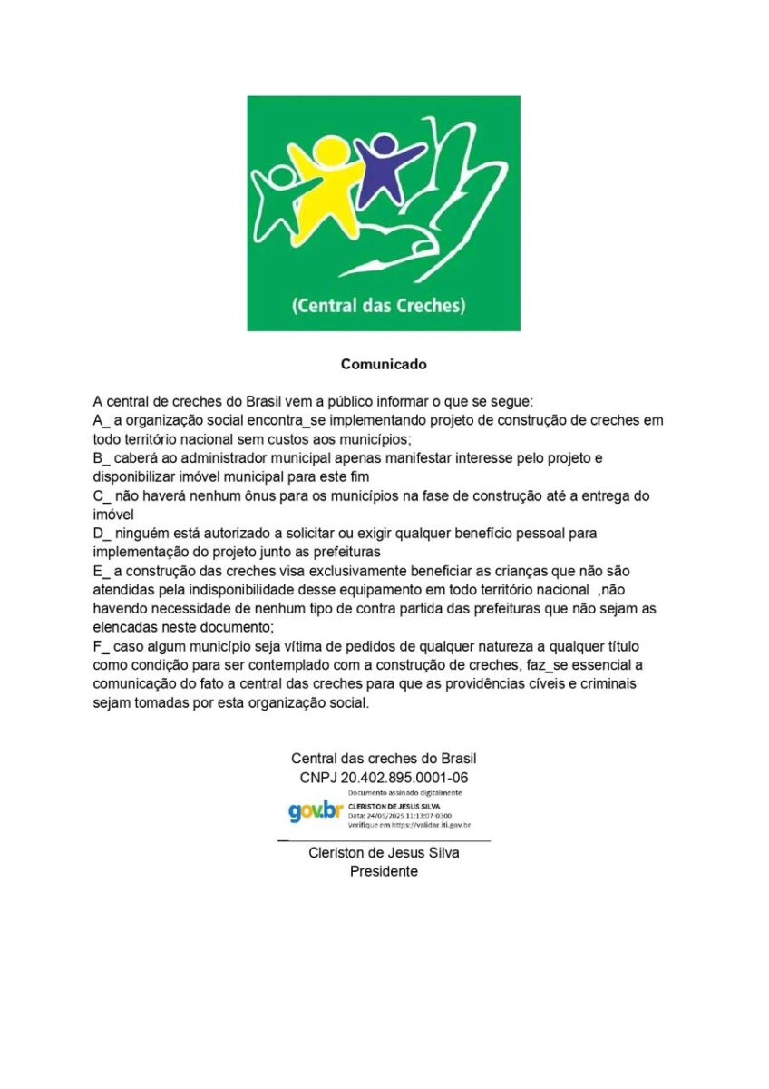 A Central de Creches do Brasil vem a público informar o que se segue: