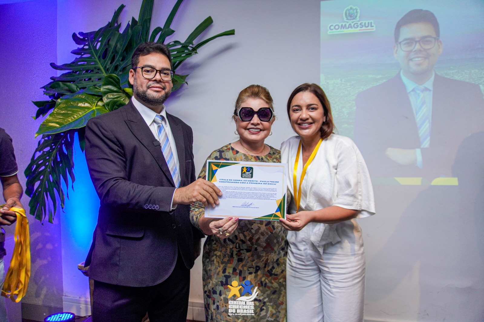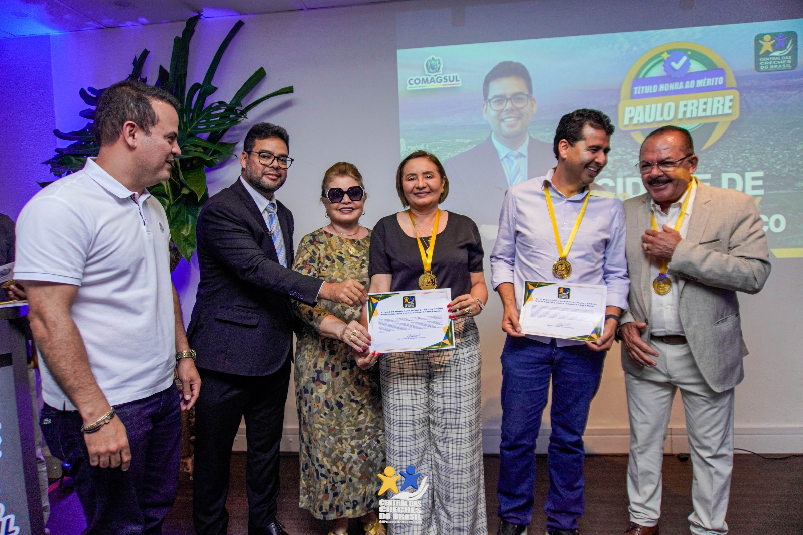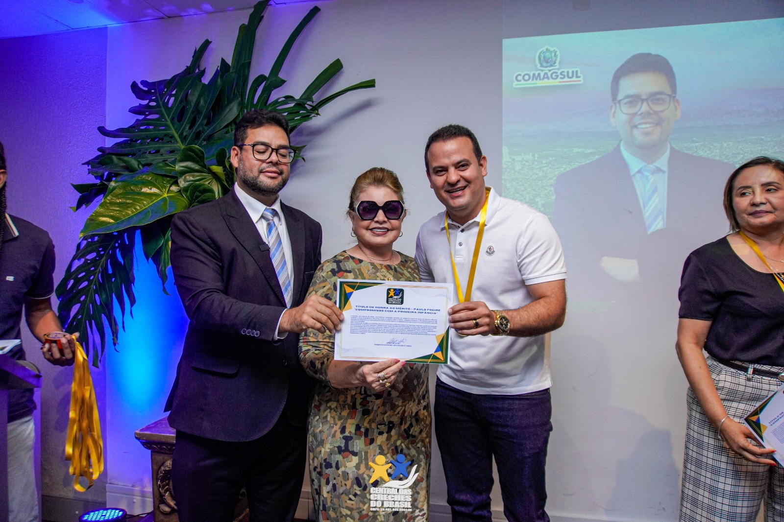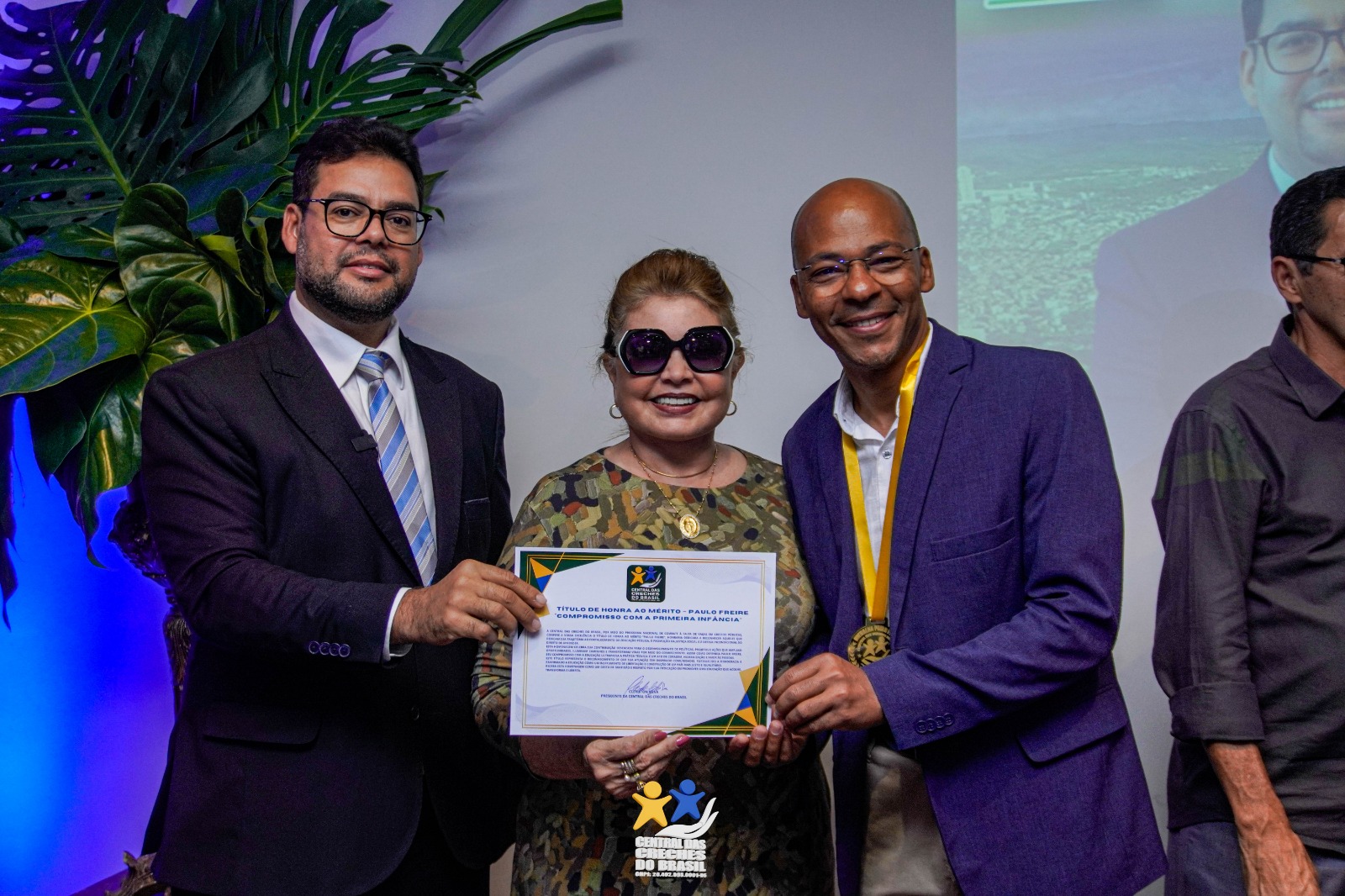 Um dos momentos mais marcantes do encontro foi a entrega do Título de Honra ao Mérito Paulo Freire – “Compromisso com a Primeira Infância”, acompanhado da medalha simbólica que representa o avanço da educação pública no país.